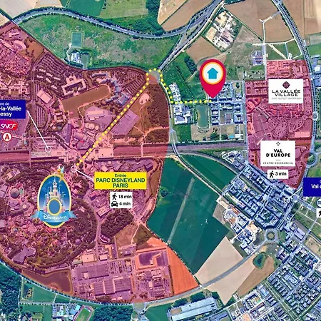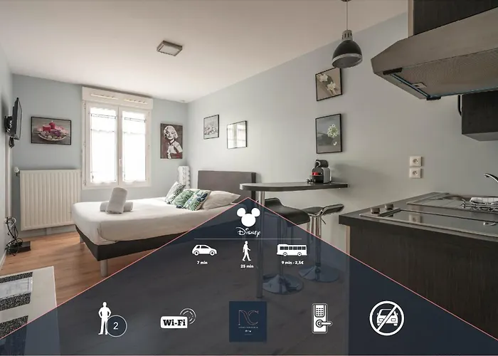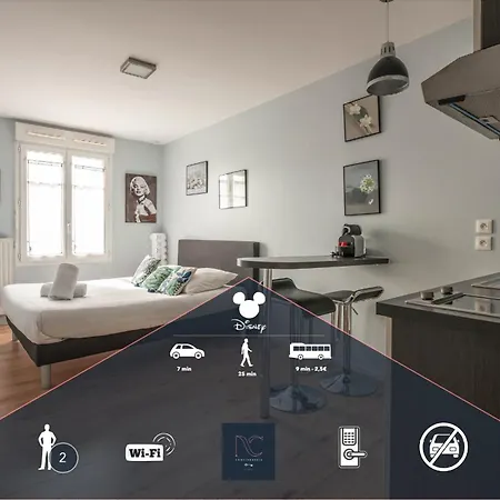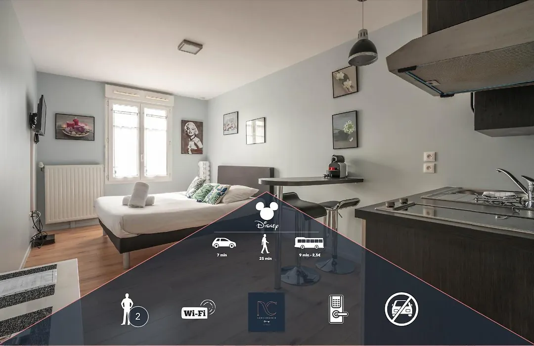 Το διαμέρισμα *Disneyland-Paris* Studio 2 Pers προσφέρει κουζίνα καθώς και δωμάτια με παροχές τσάι/καφέ, τηλεόραση επίπεδης οθόνης με δορυφορικά κανάλια και ανιχνευτές καπνού. Ντίσνεϋλαντ του Παρισιού απέχει 5 λεπτά με το αυτοκίνητο, ενώ Εμπορικό ΚέΝτρο Val d'Europe απέχει μόλις 12 λεπτά με τα πόδια.